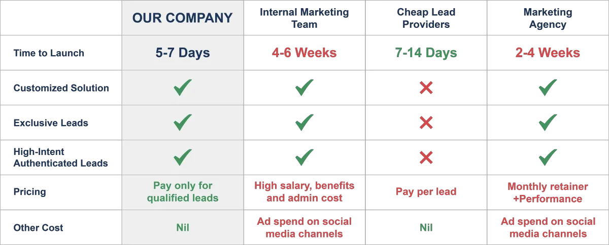 You only pay per qualified lead delivered. No retainers.
